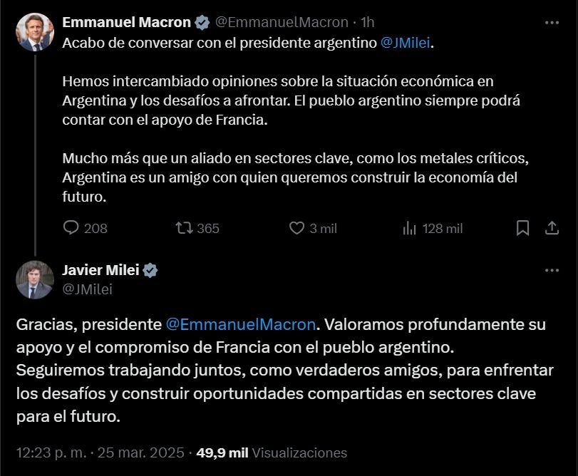 "Acabo de conversar con el presidente argentino Javier Milei. Hemos intercambiado opiniones sobre la situación económica en Argentina y los desafíos a afrontar. El pueblo argentino siempre podrá contar con el apoyo de Francia. Mucho más que un aliado en sectores clave, como los metales críticos, Argentina es un amigo con quien queremos construir la economía del futuro", expresó Macron a través de un posteo en X.