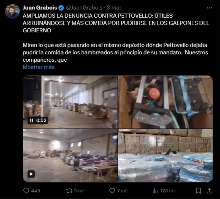 Mediante un posteo en la red social X, publicó: “La gente humilde del barrio Las Flores vio todo: los útiles, la comida, las cosas que les niegan... y esto es sólo uno de los trece depósitos". "Miren lo que está pasando en el mismo depósito donde Pettovello dejaba pudrir la comida de los hambreados al principio de su mandato. Nuestros compañeros, que tienen unas pelotas y ovarios de plomo, lograron ingresar y filmar lo que estaba pasando", escribió el dirigente, mostrando videos donde asegura que nuevamente hay productos sin entregar.