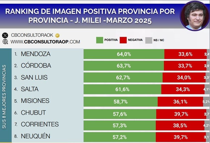 Este diagnóstico se refleja en prácticamente todas las encuestas realizadas recientemente en la provincia. Ayer trascendió un relevamiento que ubicó a Mendoza como la provincia donde el presidente Javier Milei goza de mayor popularidad en todo el país. El estudio, elaborado por CB Consultora durante los primeros días de marzo, muestra un panorama político donde el mandatario libertario alcanza un 64% de imagen positiva, mientras que su desaprobación se sitúa en 33,6%. Estas cifras posicionan a la provincia como el distrito donde el presidente obtiene su mejor valoración, superando considerablemente su promedio nacional.