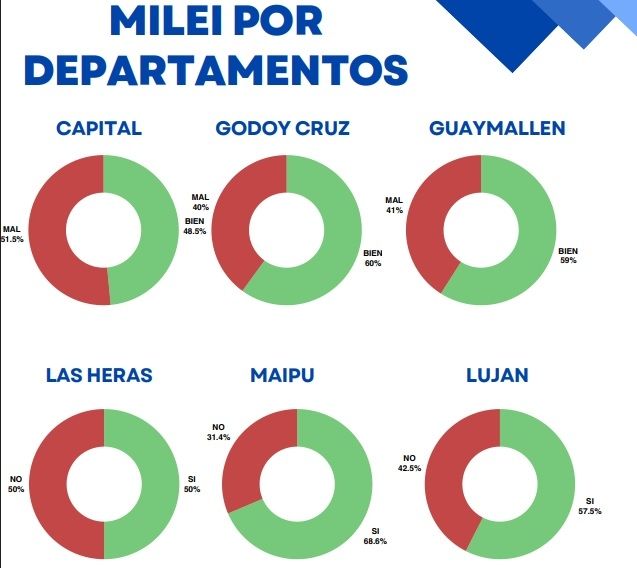 Por su parte, entre los departamentos del Gran Mendoza, Maipú encabeza el balance positivo de la gestión nacional con un 68,6% de apoyo, segundo Godoy Cruz con el 60%, Guaymallén con 59%, Luján con 57,5%, Las Heras con 50% y Capital con 48,5%.