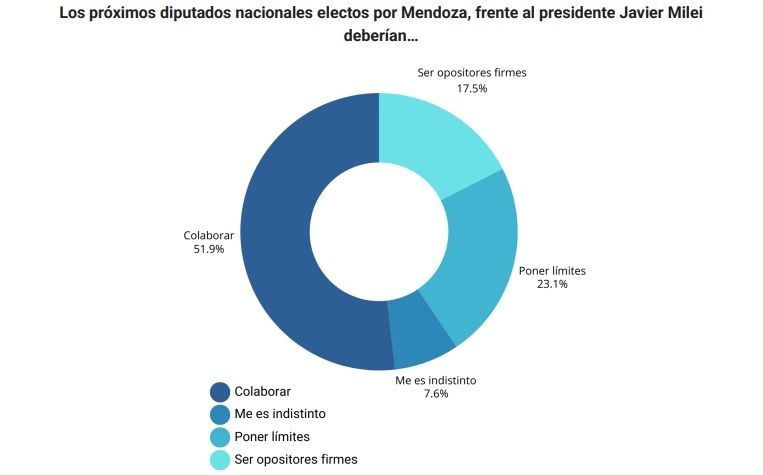 Otra de las consultas indagó sobre la postura que deberían tener los próximos diputados nacionales electos por Mendoza, frente al presidente Javier Milei. El 51,9% dijo que deberían “colaborar”, el 23,1% que habría que “poner límites”, el 17,5% que tienen que “ser opositores firmes” y al 7,6% le resulta indistinto.