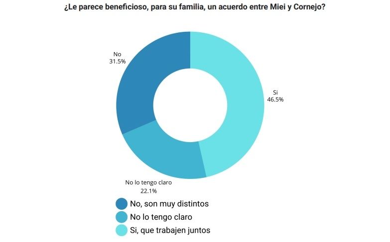 Por otra parte, los encuestadores indagaron si les parece beneficioso un acuerdo entre Miei y Cornejo. El 46,5% respondió que “sí, que trabajen juntos”, el 31,5% “No, son muy distintos”, y el 22,1% dijo que no lo tiene claro.