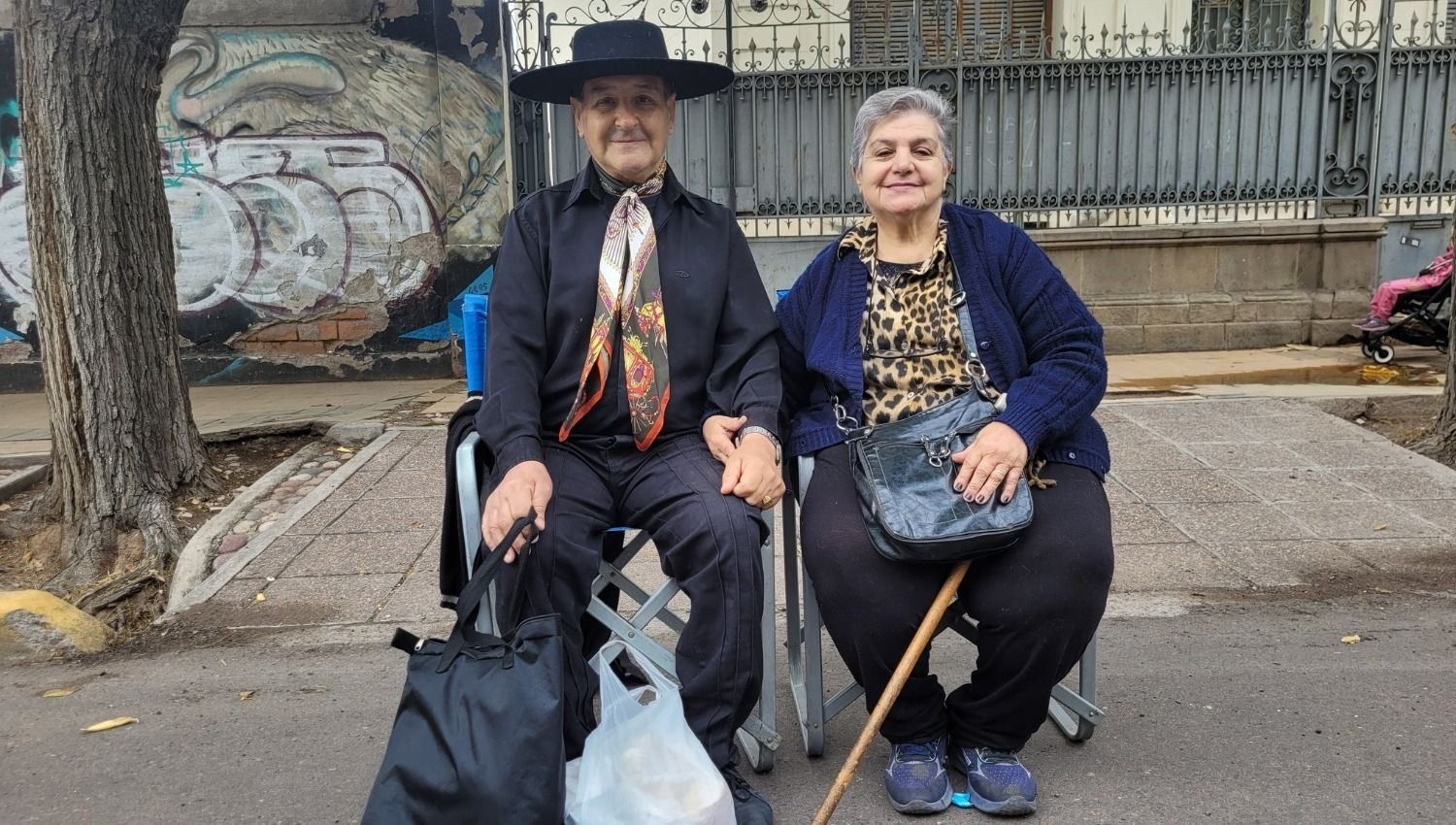 Esta pareja va todos los años, sin falta, a presenciar el carrusel vendimial que se celebra el primer sábado de marzo. La tradición de la práctica les ha dado su lugar: se sientan (siempre) sobre la Avenida Emilio Civit, mitad de cuadra entre Granaderos y Martínez de Rozas, a tan solo unos metros de la Radio Nacional. Mientras pasaban los carros, "Chiche" y María contaron su historia.