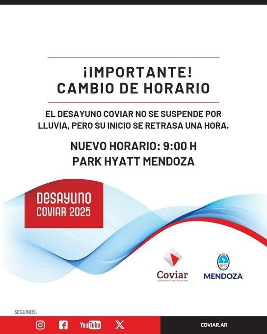 El tradicional desayuno de la Corporación Vitivinícola Argentina, Coviar, evento con el que arranca la celebración del sábado de Vendimia se iniciará con una hora de retraso por las contingencias climáticas y la lluvia que cayó esta madrugada en Mendoza.