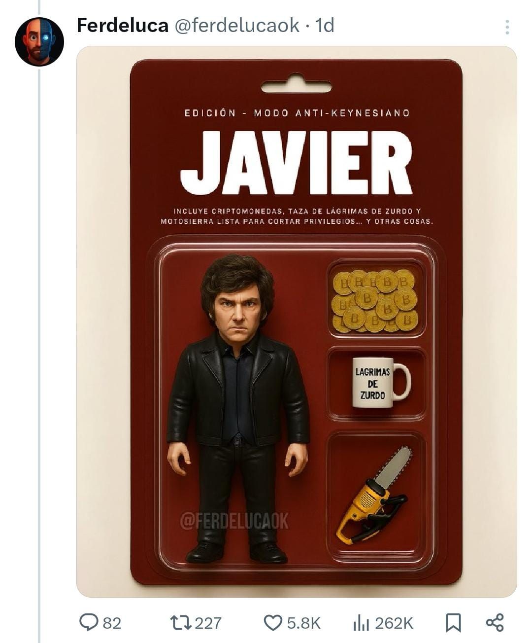 Además, el tuitero creó los muñecos de figuras claves del oficialismo, como el propio presidente Javier Milei. En el “modo anticanesiano”, incluye criptomonedas, tasa “de lágrimas de zurdo” y motosierra “lista para cortar privilegios y otras cosas”.