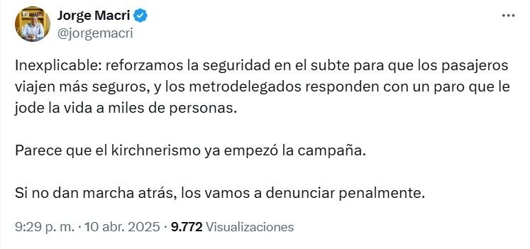 Así lo informó a través de su cuenta de X. A propósito, manifestó: "Inexplicable: reforzamos la seguridad en el subte para que los pasajeros viajen más seguros, y los metrodelegados responden con un paro que le jode la vida a miles de personas".