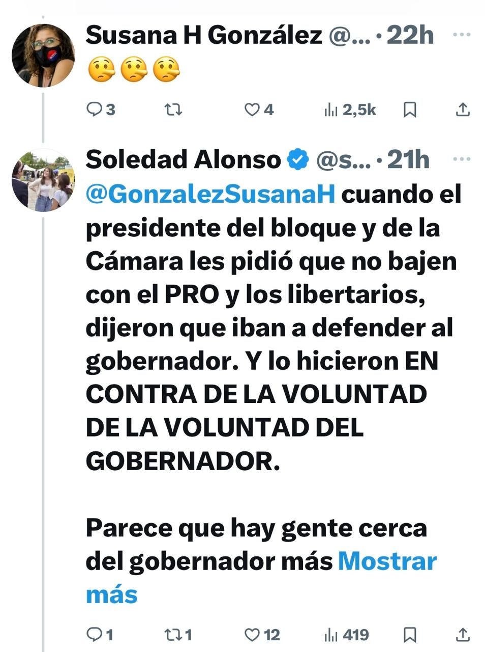 Inesperadamente la que recogió el guante, echándole leña al fuego, fue Soledad Alonso, que respondió: "Cuando el presidente del bloque y de la Cámara les pidió que no bajen con el PRO y los libertarios, dijeron que iban a defender al gobernador. Y lo hicieron EN CONTRA DE LA VOLUNTAD DE LA VOLUNTAD DEL GOBERNADOR".