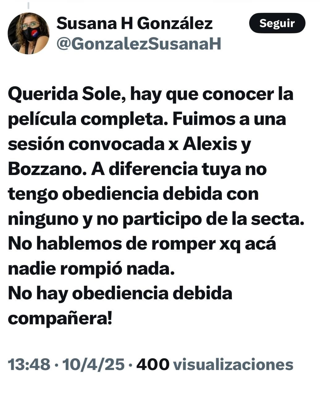 La respuesta de la kicillofista, una de las más ácidas en la Legislatura, no se hizo esperar y acusándola de pertenecer a "una secta", lanzó: "Querida Sole, hay que conocer la película completa. A diferencia tuya no tengo obediencia debida con ninguno y no participo de la secta. No hablemos de romper porque acá nadie rompió nada. ¡No hay obediencia debida compañera!".