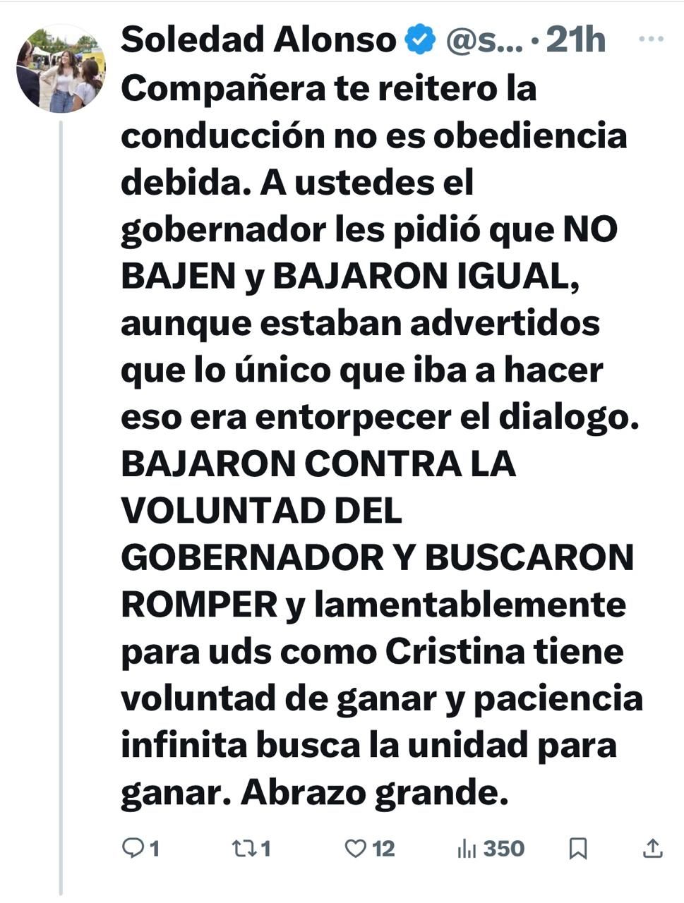 Inmediatamente hubo réplica y, afilando el lápiz, Alonso disparó: "Compañera te reitero la conducción no es obediencia debida. A ustedes el gobernador les pidió que NO BAJEN y BAJARON IGUAL", acusando a los legisladores kicillofista de "entorpecer el dialogo". Y agregó: "BAJARON CONTRA LA VOLUNTAD DEL GOBERNADOR Y BUSCARON ROMPER y lamentablemente para ustedes como Cristina tiene voluntad de ganar y paciencia infinita busca la unidad para ganar. Abrazo grande".