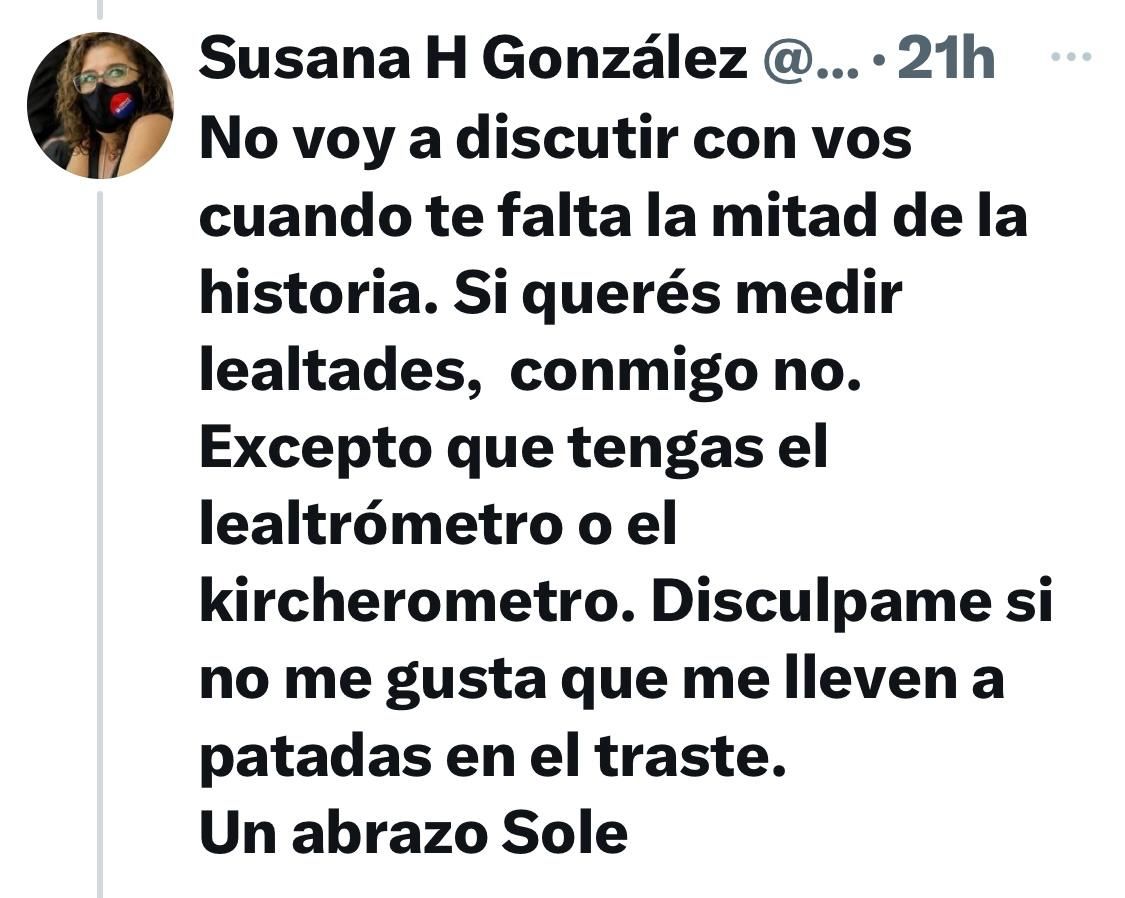 Rápida de reflejos, Susana González contraatacó con una chicana poniéndole el punto final al cruce: "No voy a discutir con vos cuando te falta la mitad de la historia. Si querés medir lealtades, conmigo no. Excepto que tengas el lealtrómetro o el kircherómetro. Discúlpame si no me gusta que me lleven a patadas en el traste".