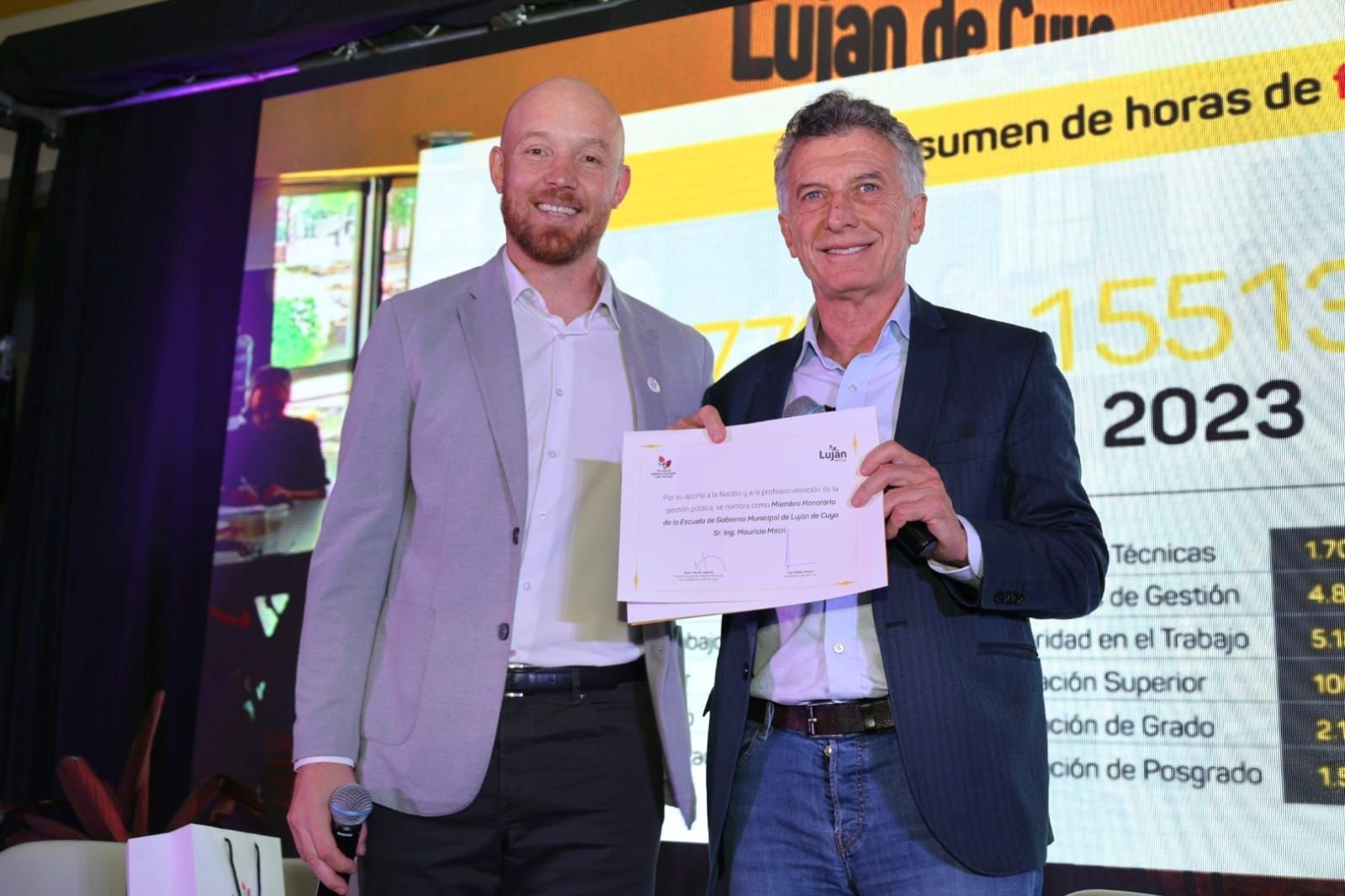 El expresidente visitó el CAU del Parque Cívico Municipal para brindar una charla de liderazgo, en el marco del comienzo del ciclo lectivo 2025 de la Escuela de Gobierno Municipal (EGM). Macri estuvo acompañado por el actual jefe comunal de Luján de Cuyo, quien lo acompañó en su ponencia dirigida a los miembros de la escuela y a otros presentes en el salón del Centro de Atención Unificada de la Municipalidad.