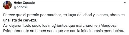 Y agregó: “Así dejaron todo sucio los mugrientos que marcharon en Mendoza. Evidentemente no tienen nada que ver con la idiosincrasia mendocina”.