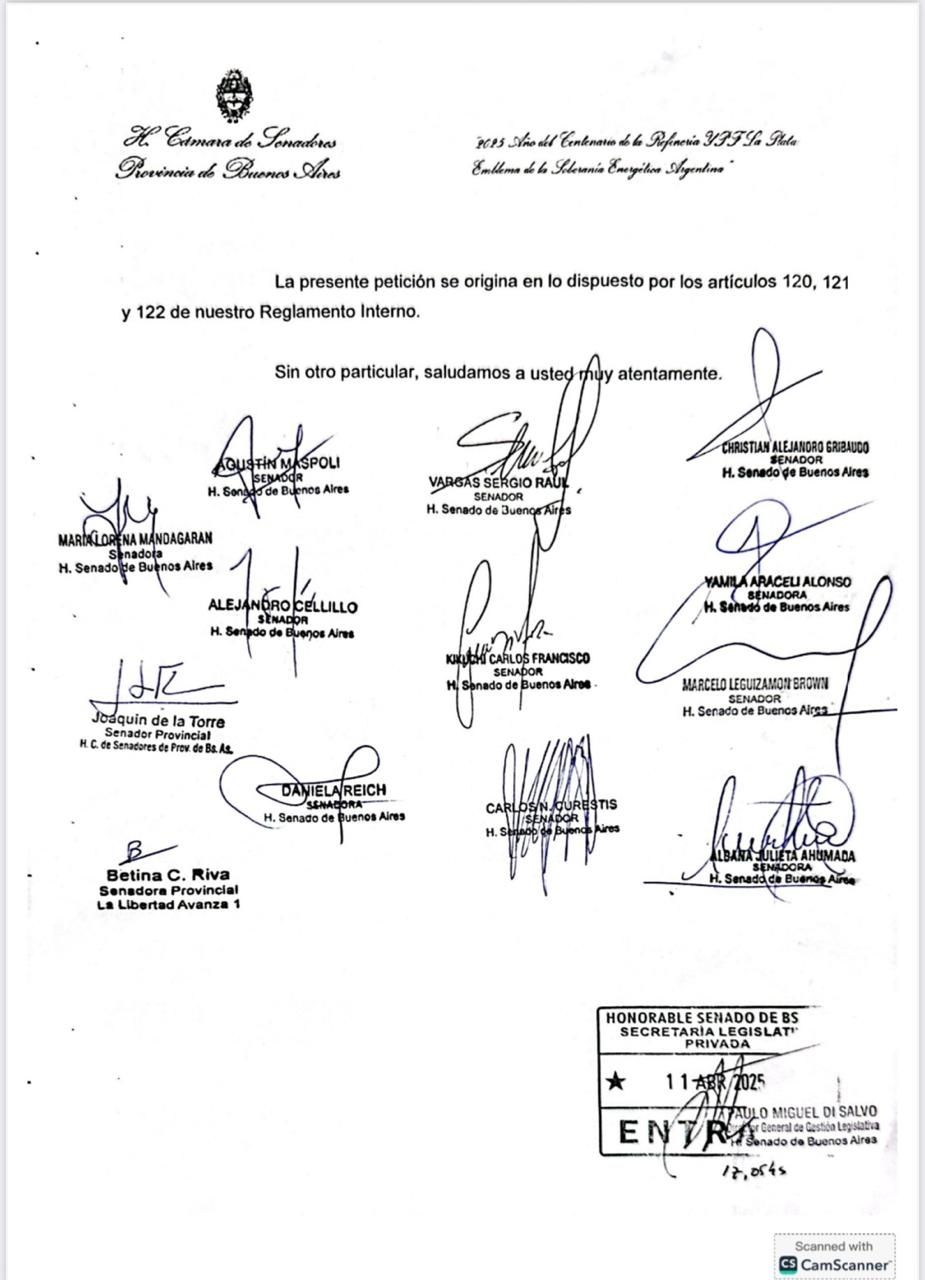 En la misiva, que lleva la firma de las autoridades de los bloques de senadores de la UCR + Cambio Federal, del PRO, y de los tres bloques libertarios, los legisladores opositores, basándose en lo dispuesto por los artículos 120, 121 y 122 del Reglamento Interno del Senado, requieren el tratamiento de los expedientes: