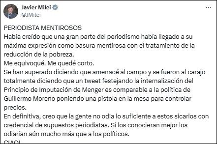 En la misma línea, completó: "En definitiva, creo que la gente no odia lo suficiente a estos sicarios con credencial de supuestos periodistas. Si los conocieran mejor los odiarían aún mucho más que a los políticos. CIAO!".