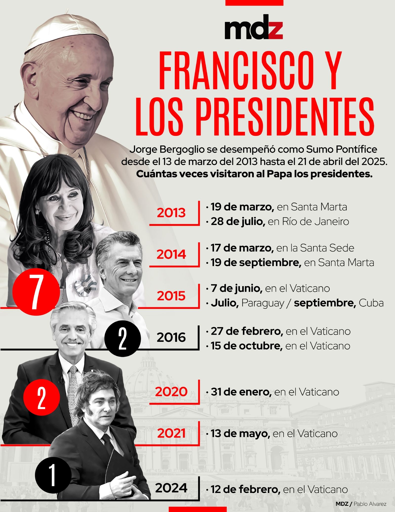 Jorge Bergoglio se desempeñó como Sumo Pontífice de la Iglesia Católica desde el 13 de marzo del 2013 hasta el 21 de abril del 2025, logrando celebrar su última Pascua. Fue el primer Papa argentino, americano y jesuita; el único proveniente del hemisferio sur. Pero, a pesar de su labor religioso, nunca dejó de lado lo político y vio pasar diferentes presidencias en su país natal desde que asumió.