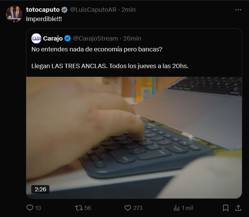 La noticia fue dada a conocer este miércoles con un video en las redes donde se ve a los tres integrantes del núcleo duro de Caputo intentar darle una clase de economía desde el Ministerio a Pablo Pazos, más conocido como "El Gordo Pablo", quien oficiará como el conductor del programa que se transmitirá todos los jueves a las 20 por este canal de streaming alineado con el oficialismo.