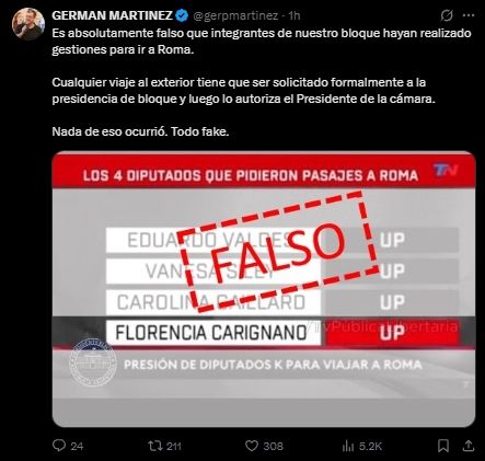 A través de la red social X, Germán Martínez explicó: "Cualquier viaje al exterior tiene que ser solicitado formalmente a la presidencia de bloque y luego lo autoriza el presidente de la cámara. Nada de eso ocurrió. Todo fake".