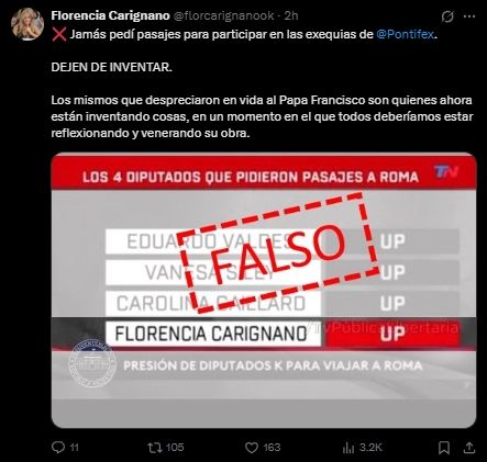 Por su parte, la legisladora Carignano, dijo en la red social X: "Jamás pedí pasajes para participar en las exequias" del papa Francisco.