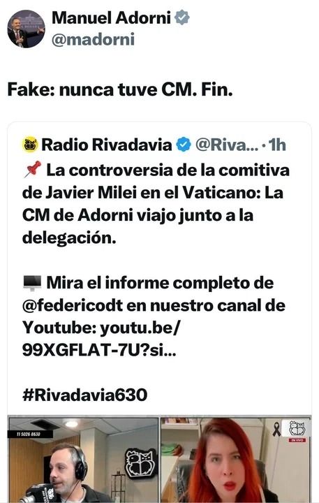 En medio de las versiones, Manuel Adorni salió rápidamente a desmentir la información a través de su cuenta oficial de X. "Fake: nunca tuve CM. Fin", escribió el vocero presidencial. Sin embargo, negó que sea su CM, pero no así que la haya llevado en la comitiva que viajó al Vaticano.