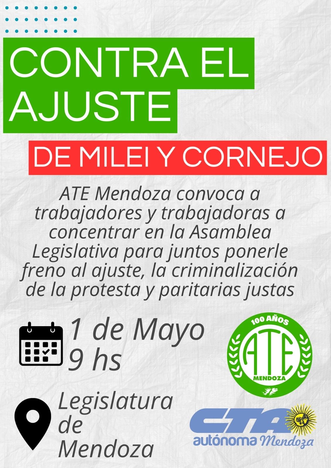 "La Plaza Independencia volverá a encontrar a la clase trabajadora en lucha, el jueves 1 de mayo, a partir de las 9 horas, dentro de la Apertura de las Sesiones Ordinarias en la Legislatura Provincial. Un Día del Trabajador que honraremos de la mejor manera que sabemos hacer: con nuestras banderas verdes combativas al frente de los reclamos inmediatos que sostenemos en cada sector laboral", expresa el comunicado del sindicato.