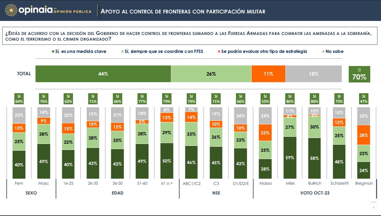 De acuerdo al estudio de opinión pública, el 44% de los 1.000 encuestados manifestó su apoyo total al despliegue militar en las zonas fronterizas, mientras que un 26% expresó su respaldo, siempre y cuando sus tareas estén coordinadas con las fuerzas de seguridad. Por otro lado, solo un 11% rechazó la medida y un 18% no tenía una opinión formada al respecto.