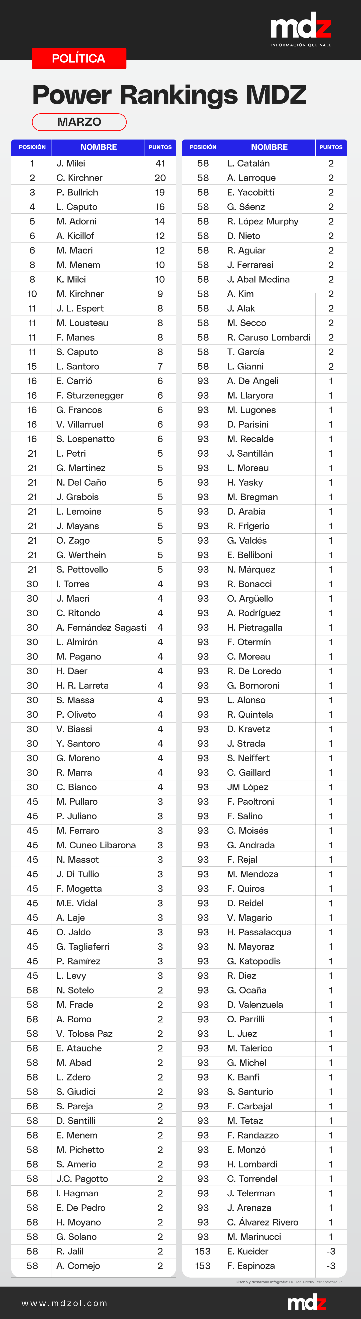 Javier Milei se recuperó de un pésimo febrero, donde obtuvo la menor cantidad de puntos desde que se realiza el Power Rankings MDZ, en julio del año pasado. El Presidente viene terminando un verano complicado, ya no solo por el Libragate, sino también por las turbulencias económicas y la pérdida de reservas del Central. De todas formas, la política argentina sigue girando en torno a su figura, con aciertos que Milei se fue anotando como los elogios que recibió de Donald Trump, la aprobación del DNU del FMI o la baja de 15 puntos en la pobreza. En el medio, visitó Bahía Blanca y anunció un fondo para ayuda a los damnificados por la inundación; fue a Expoagro y fue recibido con ovaciones; mantuvo conversaciones telefónicas con Emmanuel Macron y Volodomir Zelenski (después de la votación contraria a Ucrania en la ONU); Casa Rosada difundió videos que generaron revuelo por el 24M (“La verdad completa”) y el 8M; y se cruzó con Cristina Kirchner inaugurando la respuesta “Che Cristina” y diciendo que tiene miedo de ir presa.