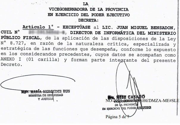 A través del Decreto Nº 918, firmado el pasado 9 de mayo por la vicegobernadora Hebe Casado, a cargo del Poder Ejecutivo, se exceptuó al licenciado Juan Miguel Bensadon, director de Informática del Ministerio Público Fiscal, de la aplicación de las disposiciones de la Ley Nº 8.727. La medida se hace en razón de la “naturaleza crítica, especializada y estratégica de las funciones que desempeña”.