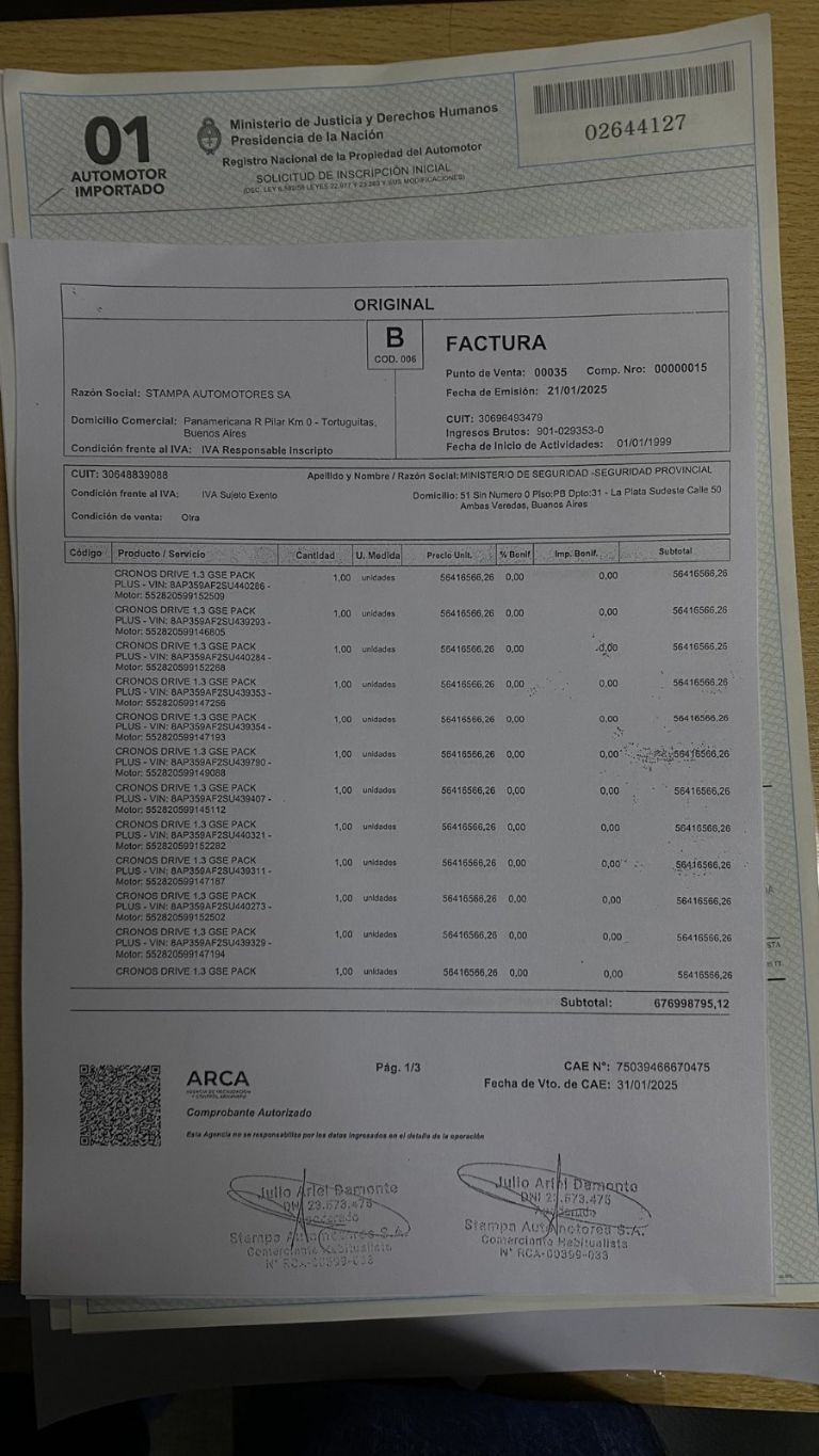 Según consta en la denuncia, desestimada por la Justicia penal provincial, el Ministerio de Seguridad comandado por Javier Alonso habría adquirido el 21 de enero del 2025 de manera directa, sin licitación previa, a la concesionaria Stampa Automotores S.A, 12 automóviles Fiat Cronos 1.3 GSE por un valor unitario de $56.416.566,26, cuando el valor de mercado de esos vehículos rondaba los $24 millones.