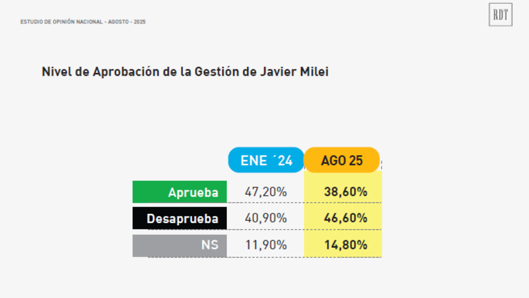 Juan Mateo Aberastain/MDZUn estudio nacional realizado por la consultora Reale Dalla Torre Consultores reveló que Javier Milei continúa liderando el ranking de imagen positiva entre los dirigentes políticos, con un 44%. Sin embargo, el informe muestra un deterioro en la evaluación de su gestión: la aprobación cayó de 47,2% en enero de 2024 a 38,6% en agosto de 2025, mientras que la desaprobación subió de 40,9% a 46,6%.