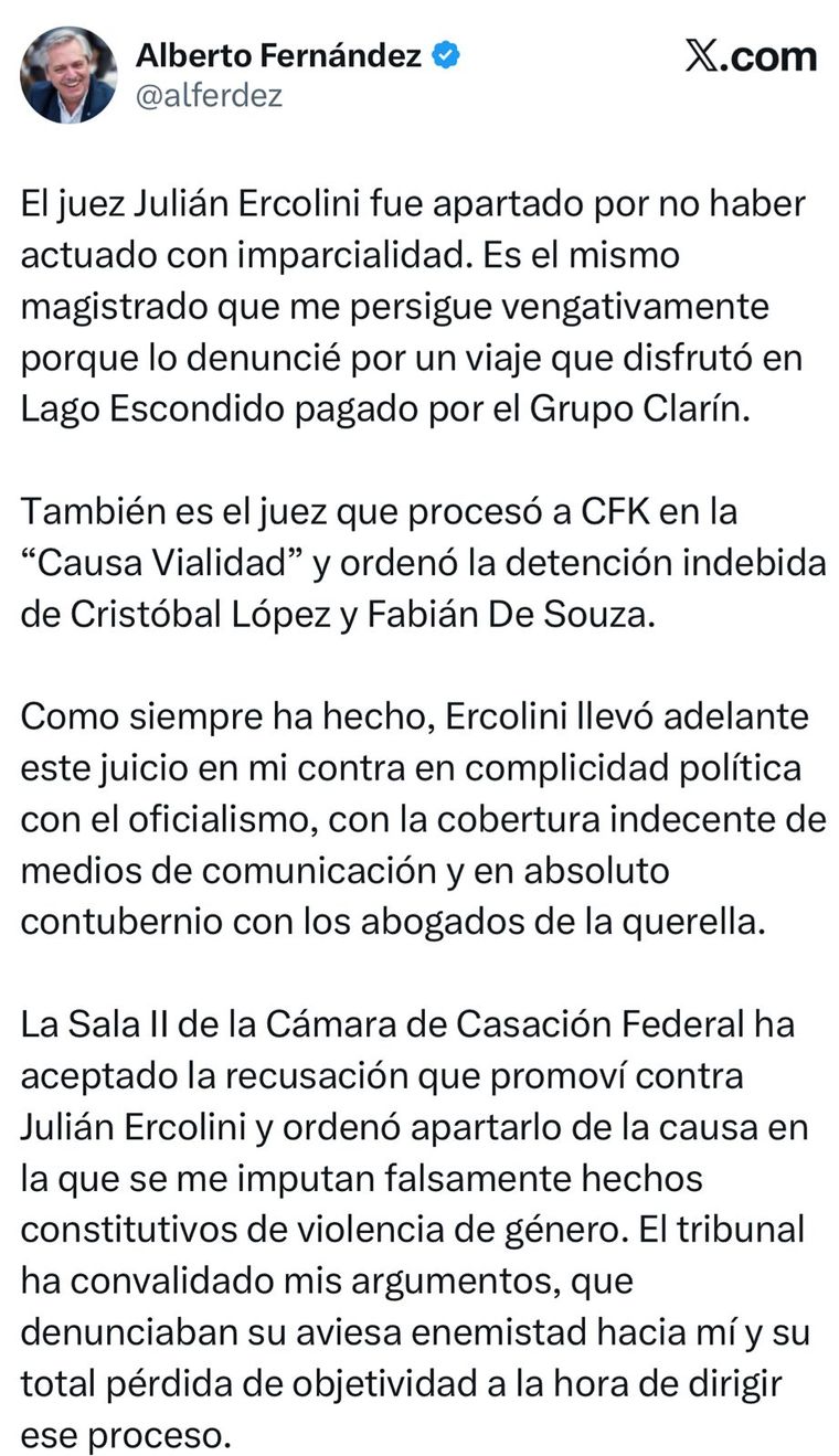 Tras la definición judicial, el expresidente se expresó en sus redes sociales, donde dejó ver su entusiasmo. “El juez Julián Ercolini fue apartado por no haber actuado con imparcialidad. Es el mismo magistrado que me persigue vengativamente porque lo denuncié por un viaje que disfrutó en Lago Escondido pagado por el Grupo Clarín”, lanzó.