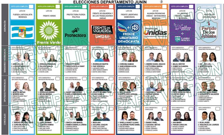 En el departamento de Junín se presentan ocho agrupaciones políticas para la contienda electoral. La competencia será entre Fuerza Justicialista Mendoza, Frente Verde, Protectora Fuerza Política, Frente de Izquierda y de los Trabajadores, Frente Libertario Demócrata, Alianza Provincias Unidas–Defendamos Mendoza, La Libertad Avanza + Cambia Mendoza y el Partido de los Jubilados.