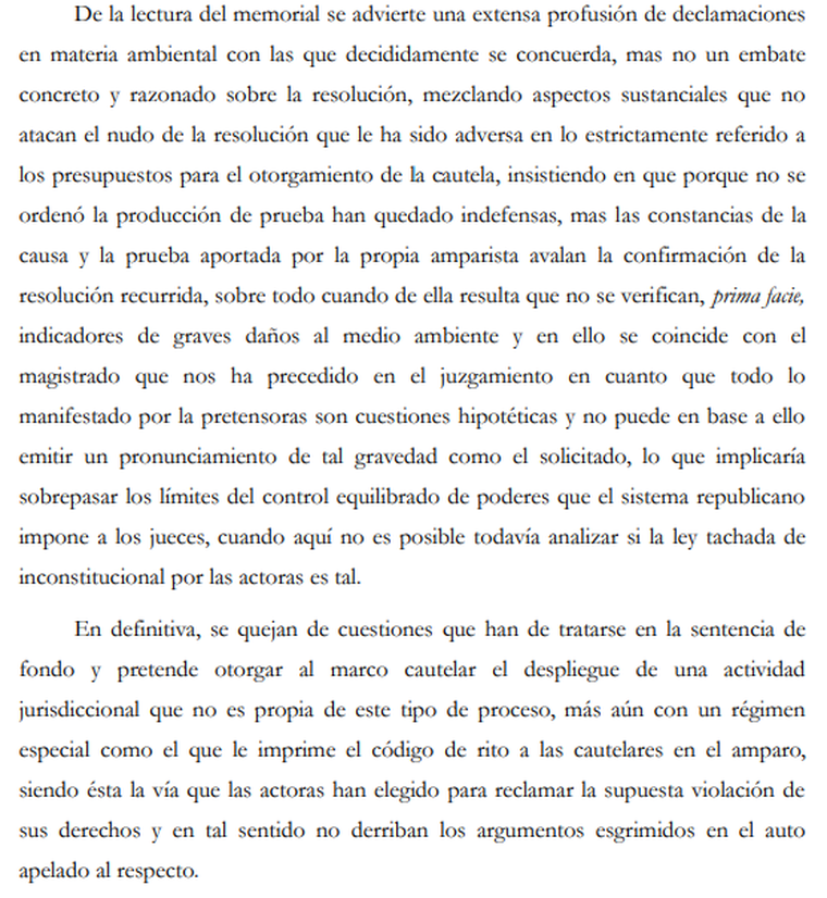 Las juezas Patricia Canela, María Delicia Ruggeri y María Emilia Funes, remarcaron sobre el fallo en primera instancia que el principio precautorio y la tutela colectiva (que fueron solicitados en el planteo judicial "no eliminan ni vuelven automáticos estos presupuestos”, y se agregó que lo ambiental “incide en la intensidad del análisis y en la ponderación del riesgo, pero no habilita a convertir la tutela urgente en una decisión de mérito encubierta”.