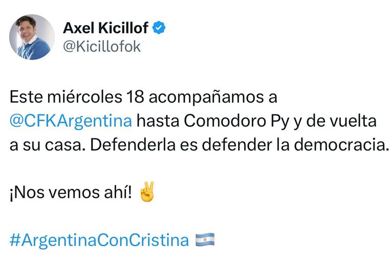 “Este miércoles 18 acompañamos a Cristina hasta Comodoro Py y de vuelta a su casa. Defenderla es defender la democracia. ¡Nos vemos ahí!”, expresó el gobernador en la antesala a la detención de la expresidenta.
