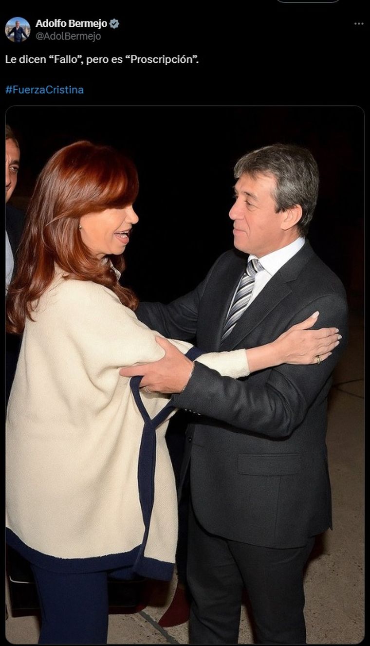 “Le dicen ‘Fallo’, pero es ‘Proscripción’. #FuerzaCristina”, publicó Bermejo en su cuenta personal junto a una imagen de él abrazando a Fernández de Kirchner.