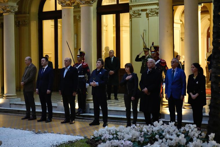 Antes de las palabras del “Coloso” y del líder libertario, hubo tiempo para café con leche, medialunas y pastafrola. “Faltaron los pastelitos, muy patrio no fue”, se quejó un secretario de Estado, entre sonrisas. También hablaron el jefe de Gabinete, Guillermo Francos, la ministra de Seguridad, Patricia Bullrich, el ministro de Salud, Mario Lugones, el ministro de Justicia, Mariano Cuneo Libarona y la secretaria de Legal y Ténica, María Ibarzabal Murphy.