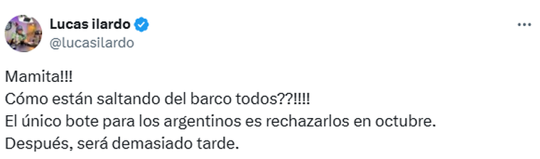 En la vereda de la oposición, el exlegislador Lucas Ilardo, referente de La Cámpora en Mendoza, también utilizó sus redes sociales para manifestar su postura ante los movimientos políticos de la jornada. Cuestionó a los dirigentes que, según sus palabras, "saltan del barco".