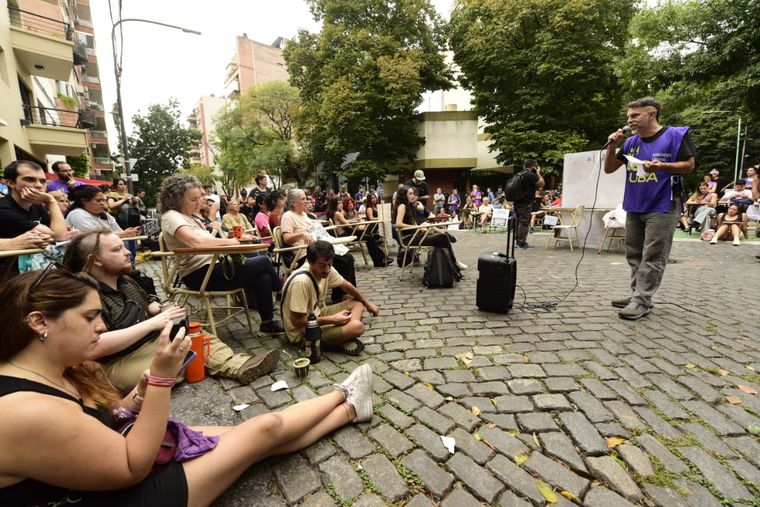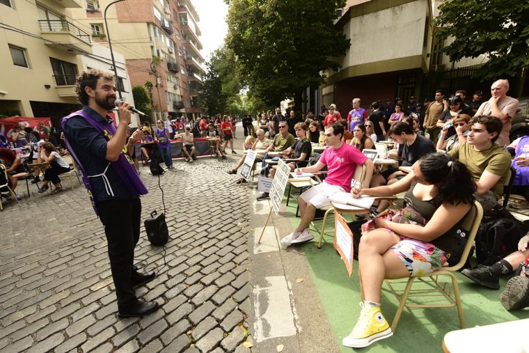 En el marco del paro nacional de 72 horas convocado por el Frente Sindical de Universidades Nacionales, docentes y alumnos de la Universidad de Buenos Aires (UBA) realizan una jornada de clases públicas frente al edificio donde reside el jefe de Gabinete, Manuel Adorni, en el barrio porteño de Caballito.