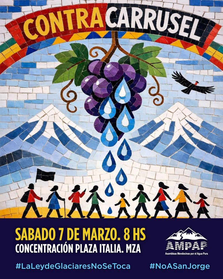 "Sin agua no hay vendimia.Sin glaciares no hay futuro. El próximo sábado 7 de marzo salimos a las calles una vez más para gritar bien fuerte ¡Nuestra agua no se negocia! ¡No a San Jorge! Entre vendimia y festejos quiere tapar el saqueo y la destrucción de nuestros glaciares. Seguimos organizados y resistiendo por el agua", dice la invitación.