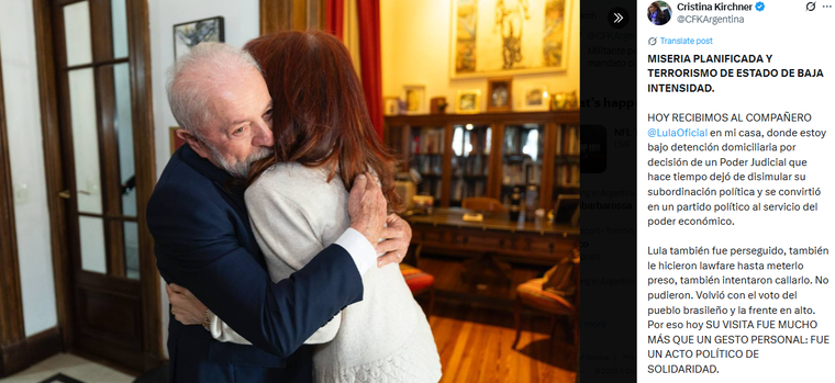 "Hoy recibimos al compañero Lula da Silva en mi casa, donde estoy bajo detención domiciliaria por decisión de un Poder Judicial que hace tiempo dejó de disimular su subordinación política y se convirtió en un partido político al servicio del poder económico", inicia el mensaje que la expresidente lanzó desde su cuenta de X, con dos fotos esperadas.