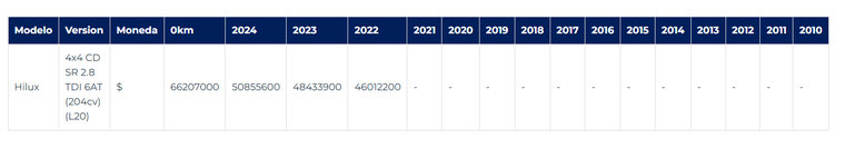 Si vamos a una pick up como la Toyota Hilux, el modelo 4x4 CD SR 2.8 TDI está en $66,2 millones si se adquiere 0km. La alícuota será de 2,5%, por lo que el boleto del Automotor estará sin descuentos en $1,6 millones.