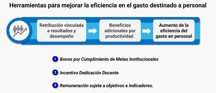 De esta forma, se hizo referencia a los bonos por cumplimientos de metas institucionales, como la productividad en la Administración Central y lo que se vendrá en el régimen 15 de los no profesionales de la Salud; el incentivo de Dedicación Docente y una remuneración "sujeta a objetivos e indicadores".