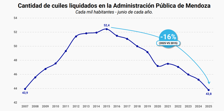 Además, se llegó al mismo índice que se supo tener en 2007 (43,9 por cada 1.000 habitantes). Este es otro guiño radical, ya que aquel 2007 fue el año de entrega de gestión de Julio Cobos al peronismo. Luego la curva fue en ascenso, con las administraciones de Celso Jaque (2007-2011) y Pérez (2011-2015).