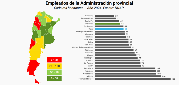 En el otro extremo aparecen Tierra del Fuego (130), La Rioja (114), Catamarca (106) y Santa Cruz (104), con estructuras de empleo público que más duplicar, incluso triplican la proporción mendocina.