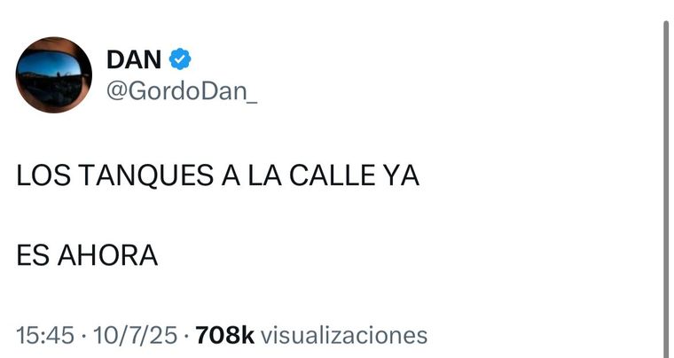 Luego, siguió con una publicación del conductor del streaming Carajo, Danir Parisini, conocido como el gordo Dan. “Los tanques a la calle ya, es ahora”, había escrito el influencer.