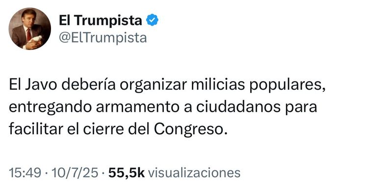 “El Javo debería organizar milicias populares entregando armamento a ciudadanos para facilitar el cierre del Congreso”, comenzó Di Tullio, con la cita a un tuit de la conocida cuenta libertaria El Trumpista. “Nos hablan a nosotros”, remarcó.
