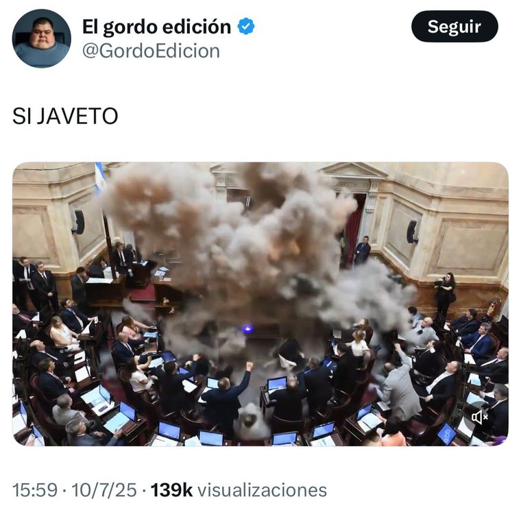 Por último, retomó un tuit de una cuenta llamada Gordo Edición, vinculada al asesor presidencial, Santiago Caputo. “Es nuestro recinto, con todos los senadores y senadoras de la Nación. Y una explosión de una bomba. Y le dice, ‘sí, Javeto’, al presidente, que nos bombardee al presidente de la República”, cerró la legisladora.