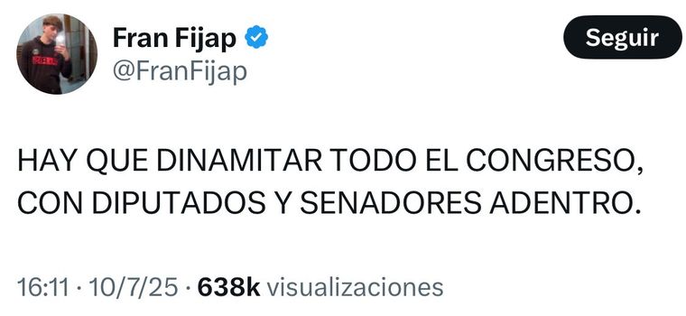 Otro de los tuiteros más conocidos, Frank Fijap, escribió en su cuenta de X que “hay que dinamitar todo el Congreso con diputados y senadores adentro”. Luego de leerlo en voz alta, Di Tullio se dirigió a uno de sus colegas y disparó con ironía: “Y vos te quejás que no te dejaron entrar con corbata. Capaz que te salvan la vida”.