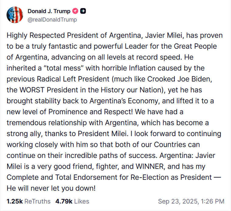 Trump cerró el comunicado con un imponente mensaje para los argentinos: "Argentina: Javier Milei es un muy buen amigo, luchador y GANADOR, y tiene mi completo y total respaldo para la reelección como presidente. ¡Nunca los defraudará!"