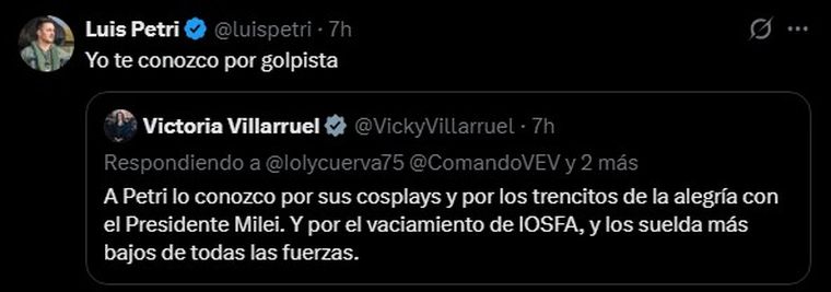Tras estas declaraciones, Victoria Villarruel salió a responderle a Petri a través de su cuenta de X: "Preocupante que no responda aún por el vacío que dejó en IOSFA y que hizo su funcionario Mendocino. Dejó a cientos de miles de militares y familias sin atención médica en los confines del país, creo que antes de divagar y comentar cómo una vecina chusma, debería ubicarse y ver cómo afronta judicialmente lo que parecería fue un desfalco de la obra social de los militares y sus familias. Sigo atentamente la causa judicial".