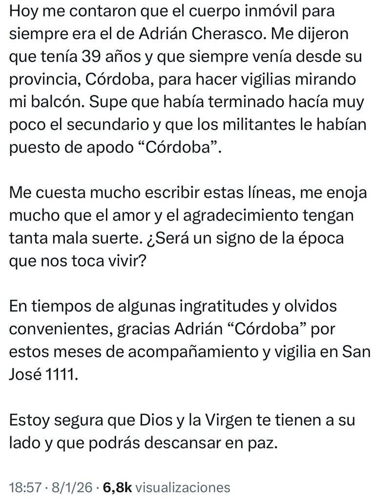 “En tiempos de algunas ingratitudes y olvidos convenientes, gracias Adrián “Córdoba” por estos meses de acompañamiento y vigilia en San José 1111. Estoy segura que Dios y la Virgen te tienen a su lado y que podrás descansar en paz”, cerró.